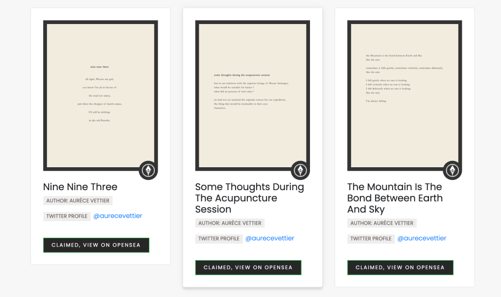 Why are NFTs important for literature? Similar to art, NFTs will revolutionize the literary world in a way that publishers nor writers are currently anticipating. Words, like images, can be documented on the blockchain, serving as timestamped sources of ownership and also fractionally distributed. Imagine a quote from a short story being sold as a canvas print directly from the writer themselves, cutting out several intermediary steps and ‘middlemen’, not to mention costs every step of the way. Even writers needing their own website for brand may be lost to NFT platforms that will allow artists and writers to distribute copies or originals of their own works directly -omitting the process of having to “link out” to another e-commerce store. Move aside, Shopify. Publishers, take heed. Literary NFTs are coming to town.